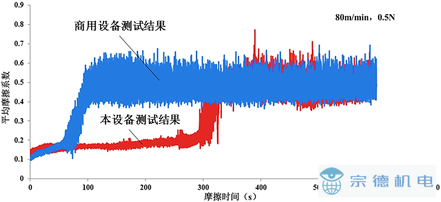 商用的球-盤摩擦試驗(yàn)用于摩擦盤端面跳動(dòng)較為嚴(yán)重,在摩擦進(jìn)入穩(wěn)態(tài)前需要較長(zhǎng)時(shí)間的摩擦過(guò)程。而一般的涂層材料較薄,在未進(jìn)入穩(wěn)態(tài)前涂層已經(jīng)發(fā)生了嚴(yán)重磨損,導(dǎo)致測(cè)得的結(jié)果是涂層基體材料與另一個(gè)對(duì)磨體的摩擦系數(shù)而非涂層本身與另一個(gè)對(duì)磨體的摩擦系數(shù),因此無(wú)法實(shí)現(xiàn)超薄涂層的摩擦測(cè)試。本超高速摩擦試驗(yàn)機(jī)由于降低了摩擦盤的端面跳動(dòng),可以大幅度的降低磨合過(guò)程,減小涂層的磨損,因此可以實(shí)現(xiàn)超薄涂層的摩擦試驗(yàn)。